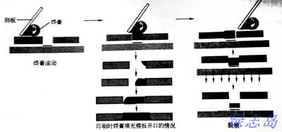 印刷時只有當焊錫膏在刮板前滾動,才能產生將焊錫膏注入開口的壓力;焊錫膏填充模板開口的程度決定了焊錫膏量;脫模的完整程度決定了焊錫膏的漏印和焊錫膏圖形的完整性,焊錫膏印刷過程見下圖: